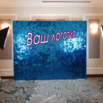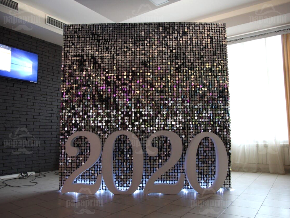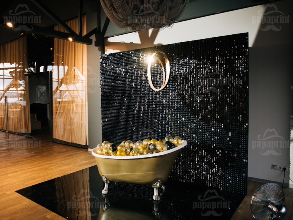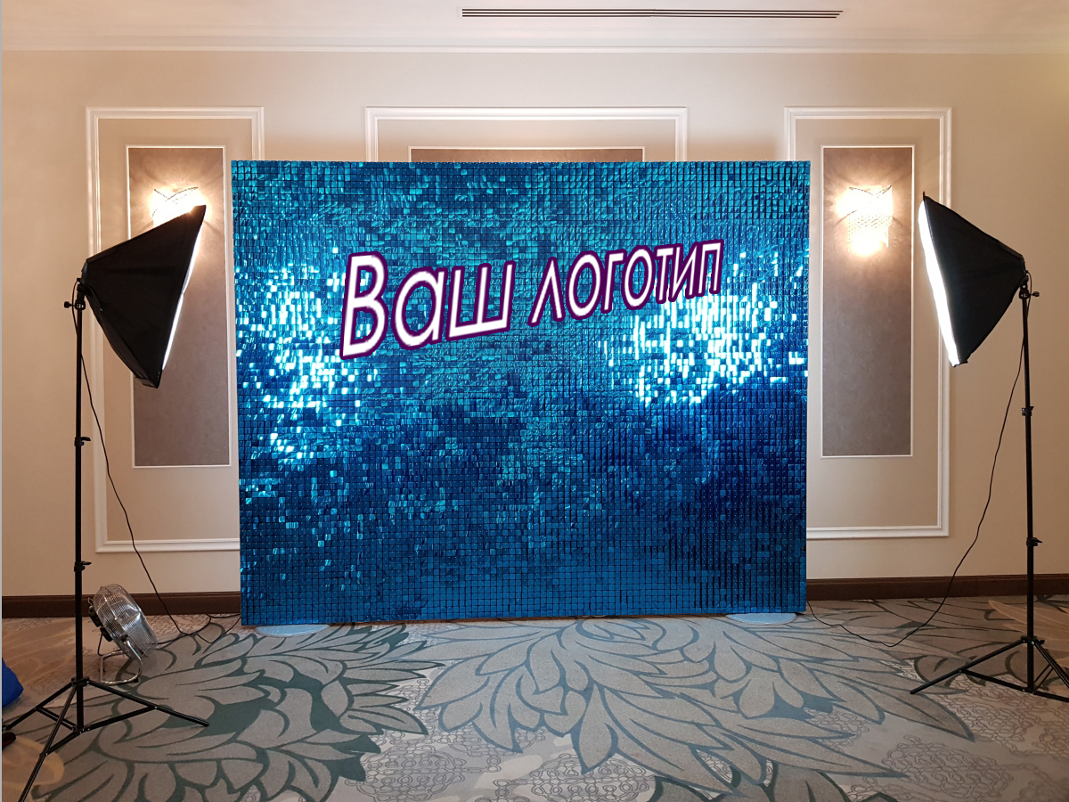 На фотозону з пайетками можна прикріпити логотип організації або прикріпити напис у тему вечірки. Додаткові елементи можуть бути виготовлені з пластику ПВХ або акрилу.