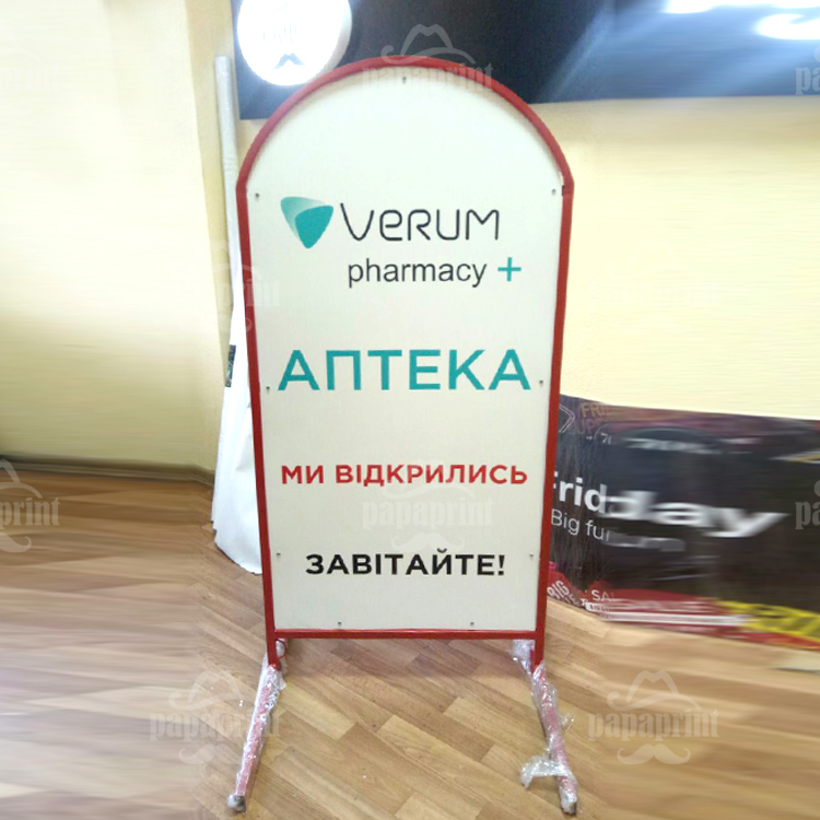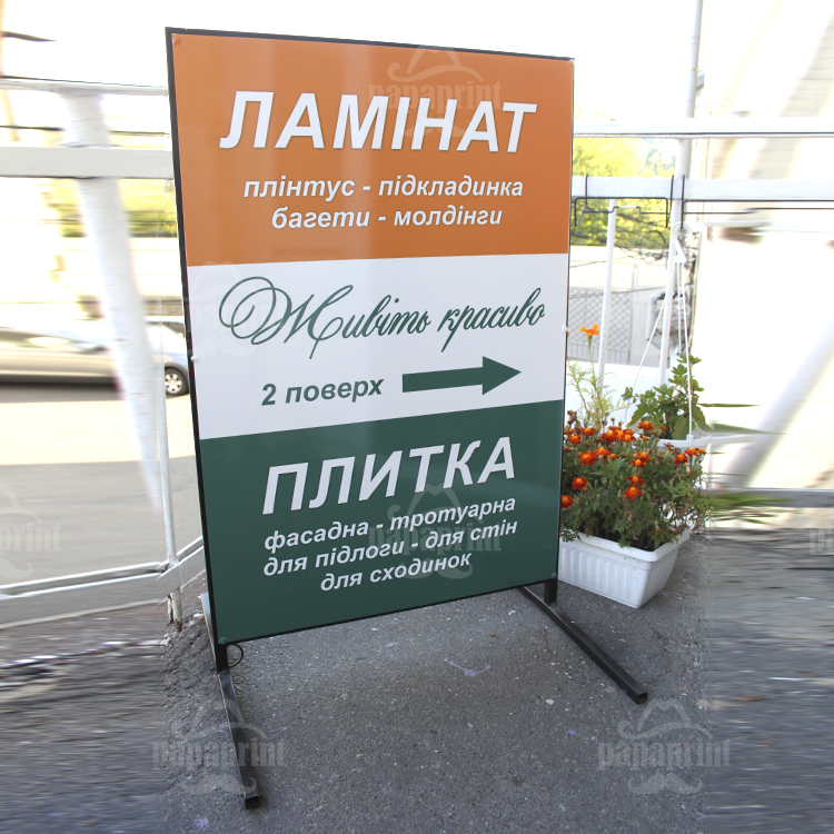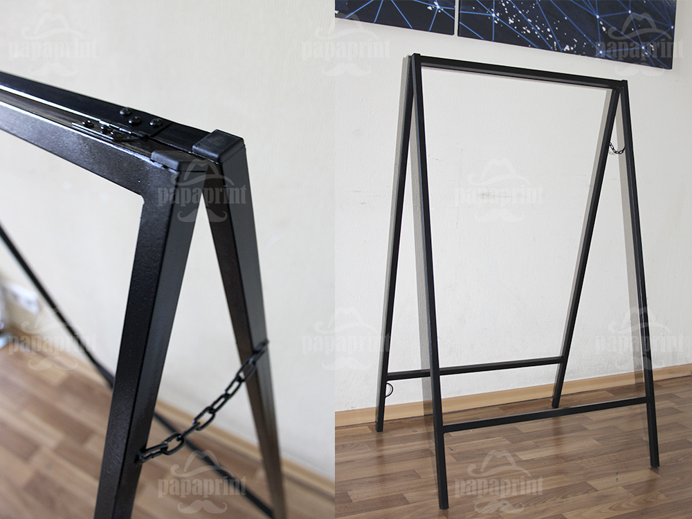 - А-подібний. Дуже поширений вид штендера серед замовників, який значно відрізняється своєю витривалістю до навколишнього середовища, а також має два поля для інформації.
